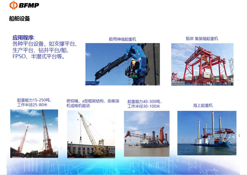 我司可提供岸边集装箱起重机、集装箱门式起重机、门座式起重机、桥式抓斗卸船机、大型造船门式起重机、大型浮式起重机、机平台起重机及伸缩起重机等。