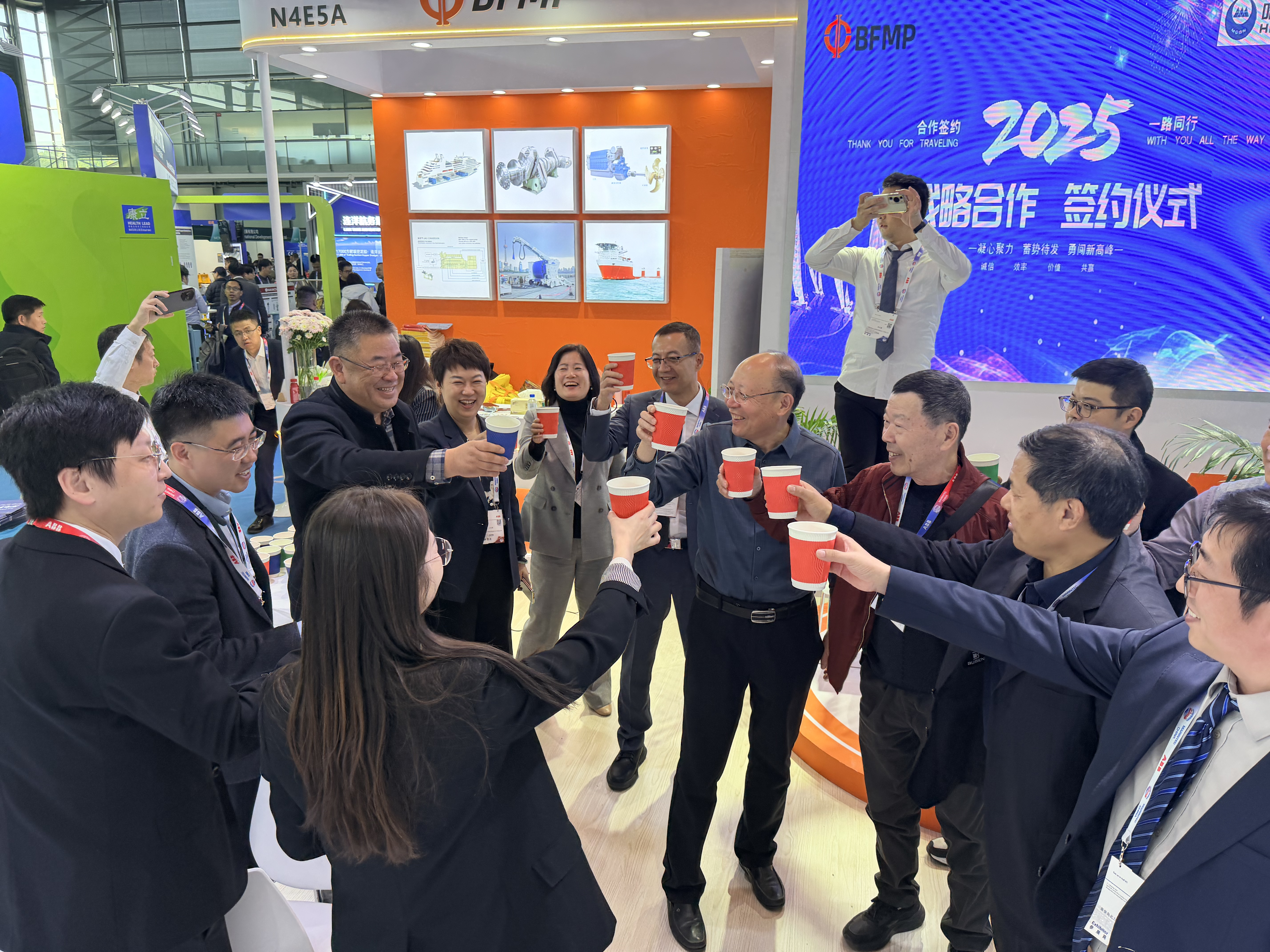 签约仪式结束后,双方代表举杯畅饮。展望未来,哈船冰轮与北方船舶将以此次展会上达成的共识为起点,持续深化协作机制,积极推动创新技术在实际场景中的应用,共同拓展国内外市场。